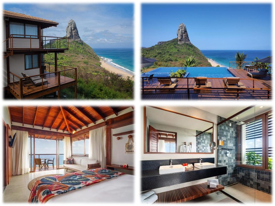 A Pousada Ecológica Akanã tem uma proposta de luxo sustentável, com arquitetura integrada à natureza e foco em conforto e exclusividade. Todas as acomodações possuem varanda e vista privilegiada, que se estende não apenas para a Praia da Conceição, mas também para a Praia do Meio, Praia do Cachorro, o Porto e ilhas ao redor. A pousada conta ainda com piscina com vista panorâmica e uma categoria de suíte com banheira com vista, ideal para quem busca uma experiência mais especial em Fernando de Noronha.